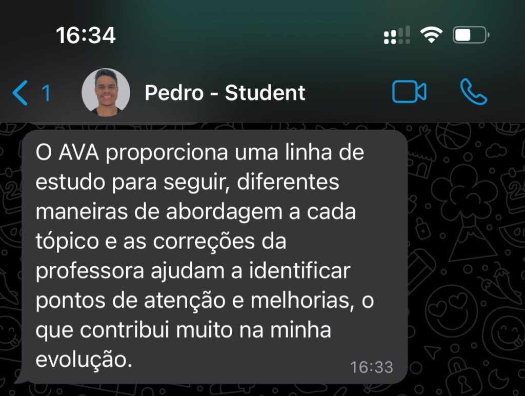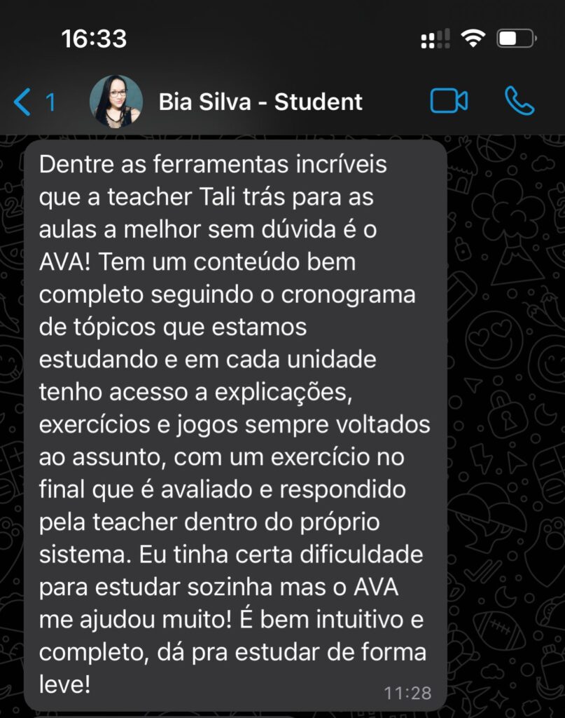 Você tem acesso direto ao WhatsApp da Teacher Tali para conversar diretamente com ela, e também quando receber a correção e feedbacks de sua tarefa, você sempre pode enviar comentários no ambiente virtual esclarecendo suas dúvidas.